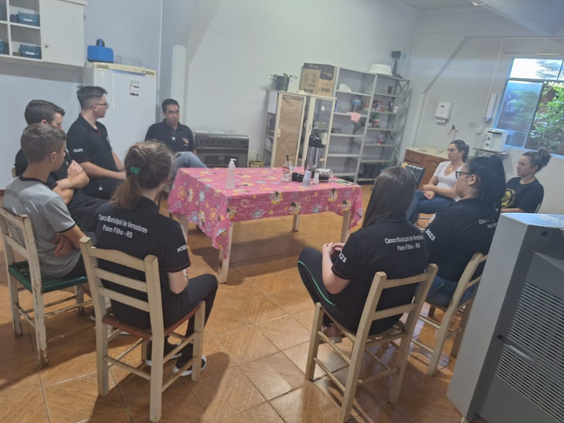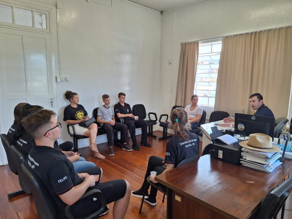 Na manhã da última sexta-feira, 22, os Vereadores Jovens 2023: Milena Caldart dos Santos, Emanueli Beltrame, Felipe Roberto Bacchi, Kauan Cavalheiro, Roberta Zanchet Piana e Willian Gabriel Frizon estiveram nas duas Secretarias do município que ainda não tinham visitado. Estavam acompanhados pela Presidente da Câmara, Vereadora Sidia Lurdes Martini Bessegato, pela Coordenadora do Programa Vereador Jovem/Escola Vai à Câmara, a Oficial Legislativo Maria Isabel Gelaim Vanz e pela Vice Diretora da E.E.E.B. Luiza Formighieri, parceira do Programa, Professora Rosimeri Souza de Paula.