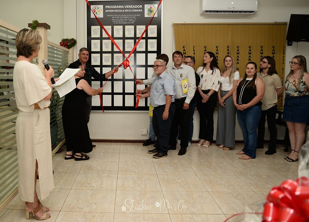 O descerramento da fita inaugural foi realizado pelo Presidente da Câmara, Ver. Vanderlei Ernesto Luppi, pela Diretora da Escola Estadual Profª Fabiana Bárbara Grazziotin Dias, pelo idealizador do Programa, ex-vereador João Carlos Arcego, pelo Vice-presidente dos Vereadores Jovens 2024, Felipe Costenaro e pelo Prefeito Municipal Genes Jacinto Moterle Ribeiro.